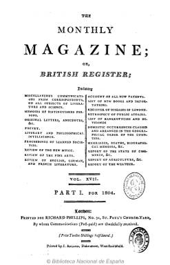 Esta revista mensual londinense estuvo publicándose, con variaciones en el título, desde febrero de 1796 a junio de 1843, fundada por el escritor y afortunado mercader de libros sir Richard Phillips (1767-1840), ejerciendo como su primer editor el médico y literato John Aiken (1747-1822), afín al unitarismo teológico. Tanto su fundador, en asuntos de carácter político, como, ocasionalmente, el coleccionista de arte John Leigg Philips publicaron en sus páginas, pero entre los colaboradores más distinguidos de la revista se encontraron los grandes fundadores de la literatura y el arte del movimiento pre-romántico y del romanticismo inglés, como el poeta, pintor y grabador William Blake (1757-1827); el también poeta, crítico y filósofo Samuel Taylor Coleridge (1772-1834), e introductor del idealismo alemán en la cultura inglesa, al que se le atribuye una serie de ensayos publicados en la revista entre 1796 y 1799 bajo el título The Enquirer; y el escritor y ensayista Charles Lamb (1775-1834); así como el prolífico escritor y clasicista George Dyer (1755-1841) y el asimismo poeta y literato Henry Neele (1798-1828), que iniciará su colaboración de forma anónima a partir de 1814. La colección de este título en la Biblioteca Nacional de España sólo la forma el volumen 17 (semestral), que va de febrero a julio de 1804, integrado por siete entregas secuenciadas de más de un centenar de páginas cada una, con foliación continuada, y compuestas generalmente a dos columnas, aunque también a una, en un formato en octavo. El primer número comienza con un sumario de los contenidos generales de la revista, y al final del último ofrece un amplísimo índice general del volumen, que incluye a los autores. También inserta unos grabados de un gran meteorito, tal como se pudo contemplar en Greenwich y en Soho Square. Sus contenidos, de carácter original, son comunicaciones y misceláneas de sus denominados “corresponsales” sobre asuntos varios de carácter literario y científico; memorias de distinguidas personalidades; textos de poesía, literatura, filosofía y anécdotas; actas de sociedades científicas; reseñas de obras de la literatura inglesa, alemana o francesa, y de obras musicales o de bellas artes; listados de novedades bibliográficas, entre estas las importadas, o resúmenes de asuntos políticos; pero también publica informes sobre comercio y agricultura, listados de ganancias y quiebras empresariales, referencias de nuevas patentes, estadísticas de matrimonios y defunciones, con perfiles biográficos; asuntos locales de los diversos condados ingleses e información meteorológica. Entre 1839 y 1840 la revista fue editada por el escritor religioso inglés Francis Foster (1808-1871) y el periodista y poeta John Abraham Heraud (1799-1887. Su contenido en este nuevo periodo sirvió para la popularización de la filosofía post-kantiana y el movimiento idealista basado en la educación infantil y el socialismo. En sus páginas también llegaría a aparecer el primer relato de Charles Dickens (1812-1870), que al publicarse en volumen adoptaría el título Sketches by Boz (1836), escritor que colabora en la revista entre 1833 y 1835.