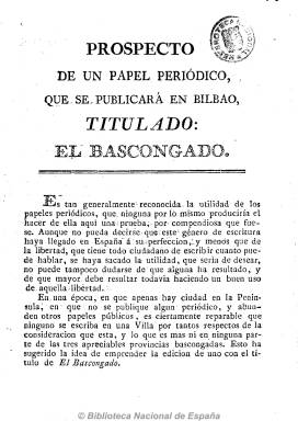 Periódico político y constitucional que se publicó de 1813 a 1814. Su director fue el jurista Toribio Gutiérrez de Caviedes. Es considerado como el primer periódico de Bilbao y puede afirmarse que en él se sitúa el origen de la prensa bilbaína. Las posiciones políticas de “El Bascongado” son, en general, de un liberalismo firme pero conciliador y en sus páginas se refleja el agitado ambiente de la zona después de la derrota de las tropas francesas por parte de los ejércitos de Wellington. Aunque el periódico carece de epígrafes, tenía coherencia a la hora de presentar sus contenidos: un primer bloque estaba dedicado a artículos de opinión, un segundo a noticias de España y del exterior, y un tercero a información comercial y pequeñas noticias locales. Recoge hechos históricos importantes para la historia de España, como el final de las guerras napoleónicas y la vuelta de Fernando VII a España.