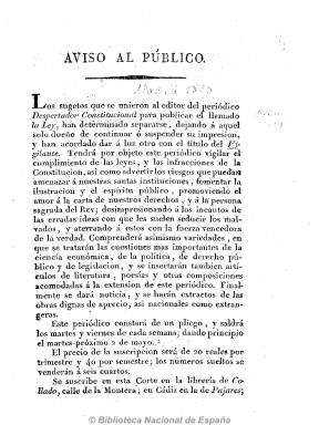 Uno de los numerosos periódicos de escasa vida que aparecen en la capital de España tras la restauración de la Constitución de 1812. La Biblioteca Nacional de España sólo dispone de su prospecto, de dos páginas, en el que anuncia su salida para el dos de mayo de 1820, y tras una corta vida de dos meses, debió desaparecer a finales de julio de ese mismo año. Por el citado prospecto se sabe que fue obra de un “grupo” que se separa del impresor y editor de El despertador constitucional con el que se había asociado para redactar La ley. También el prospecto, impreso por J. del Collado, señala que este periódico sale los martes y viernes “para vigilar el cumplimiento de las leyes y las infracciones de la Constitución”. Debió tener un carácter noticioso y literario y una tendencia liberal moderada.