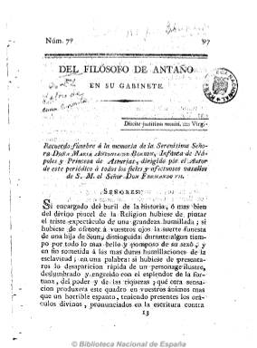 Estampado en Madrid por Francisco Martínez Dávila, impresor de Cámara de S.M. y “con licencia del excelentísimo señor capitán general”, puede tratarse de una reedición o una segunda época del periódico El Filósofo de Antaño, impreso en Cádiz entre 1813 y 1814 bajo un título que hace referencia al seudónimo de Francisco Alvarado, siendo su carácter antirreformista, servil y monárquico borbónico, y que ha sido calificado como “grosero y desaprensivo”, escrito con un “burdo sentido del humor”. La colección de este título de la Biblioteca Nacional de España consta sólo del número 7, de 20 páginas, dedicado a la memoria de María Antonia de Borbón, acompañado de un suplemento a dicho número, de cuatro páginas, en el que da cuenta de los procesos de “purificación”, por lo que debe corresponder a una fecha inmediatamente posterior al regreso de Fernando VII.