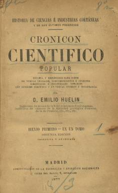 Publicación del ingeniero de Minas y destacado publicista y divulgador de las ciencias y las tecnologías de la segunda mitad del siglo diecinueve Emilio Huelín Newman (1829-1904). En 1872 había editado un primer tomo, correspondiente al bienio 1870-1871,de este Cronicón… en el que reunirá, de forma cronológica y temática, sus artículos publicados previamente en la sección Revista científica, de la que se había hecho cargo, de La Ilustración española y americana (1869-1921), al advertir que estaban siendo reproducidos y traducidos en numerosos periódicos, usando también así una fórmula editorial equiparable a la del Année Scientifique et Industrielle, que el asimismo divulgador científico francés Louis Figuier (1819-1894) venía publicando con gran éxito desde 1857 recogiendo sus propios textos aparecidos previamente en La Presse.