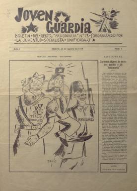Con el título Joven guardia se publicaron otros periódicos, como el subtitulado “periódico de las Juventudes Comunistas”, entre 1934 y 1935; otro fue “órgano de la Federación de J.S.U. de Euzkadi”, en 1936, y el que llevaría el subtítulo “boletín de información de la Juventud en armas”, a partir de 1937. En este caso, se trata de un periódico de cuatro páginas, compuestas a cuatro columnas, con el pie “Imp. De Radio Sur del P. Comunista y Radio 4 de la J. Unificada”, que aparece sólo indicado en su primer número. En el trabajo de De la Granja y Reig Tapia (1993) sobre la bibliografía de Manuel Tuñón de Lara (1915-1997), se indica que éste fue el director de este diario en el verano de 1936, siendo secretario de Prensa de la Comisión Ejecutiva de Juventudes Socialistas de Madrid, en cuyas páginas llegó a publicar dos artículos sin firma. El secretario general de las JSU de Madrid fue el periodista Felipe Muñoz Arconada (-2003), que también lo sería en la batalla del Ebro.