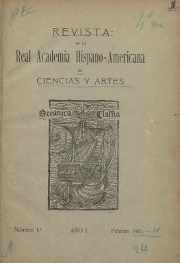 Órgano de la Real Academia Hispano-Americana de Ciencias y Artes, inaugurada el tres de enero de 1910 en Cádiz, en cuya Escuela de Artes e Industria tenía su sede. El objeto de esta entidad es “cultivar las relaciones artísticas, literarias y científicas entre España y América”, según sus estatutos, cuya presidencia de honor fue ostentada por el rey Alfonso XIII, siendo sus socios protectores los jefes de Estado de las naciones americanas, el ministro español de Instrucción Pública y el presidente de la Unión Ibero-Americana de Madrid. Su director será Cayetano del Torno; vicedirectores, Victorio Molina y Juan A. Gómez Aramburu; sus secretarios, Pelayo Quintero y Atauri (sección española), Eduardo de Ory (sección extranjera) y Agustín García Gutiérrez (régimen interior), y su archivero-bibliotecario, Pedro Riaño de la Iglesia. El consejo de redacción y administración de la revista lo integran Arturo Marenco, Juan Reina, el consiliario Carlos Meany y los citados Pedro Riaño y Pelayo Quintero.