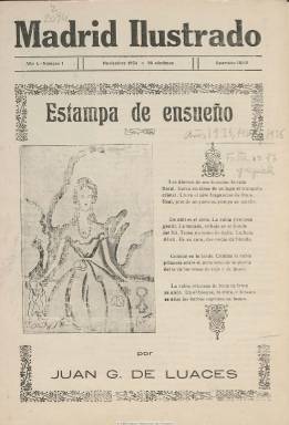 Publicación mensual de tan sólo ocho frugales páginas por entrega, obra personal sin duda de quien ha sido considerado como el traductor más prolífico de la posguerra española, Juan G. de Luaces, cuyo nombre y apellidos completos corresponden a Juan González-Blanco Luaces (1906-1963), según el trabajo publicado en Arbor por Marta Ortega Sáez (2009), y que al comienzo del periodo republicano había sido representante de la Juventud Republicana Federal. Luaces comenzó a publicar su revistilla en noviembre de 1934, siempre visada por la censura impuesta tras los acontecimientos del mes de octubre de ese año, reproduciendo casi siempre en su primera página algún poema, junto a un dibujo de Román, de los que integran el libro Estampas que acaba de publicar ese año. El escritor utilizó la revista para publicitar su obra creativa, y contrasta este carácter puramente literario de su primera plana con otros contenidos que impregnan las páginas interiores: comentarios de actualidad política internacional y nacional desde una posición defensora del moderantismo, breves semblanzas laudatorias no sólo de los presidentes de la República y del Gobierno sino de personajes del mundo de las finanzas, entre otros, junto a otras gacetillas tan dispares entre sí como dar cuenta de una cena castiza en el Mesón del Segoviano o una descripción de la Hemeroteca Municipal de Madrid, con otras noticias económicas y corporativas que son cuasi publicidad encubierta de entidades bancarias, de seguros y de otras grandes empresas que, además, son las que patrocinan la revista a través de inserciones publicitarias. A partir de agosto de 1935, el nombre del director aparece indicado en la cabecera, además de añadirle el subtítulo “publicación literaria”, publicación que se presenta más como un mosaico variopinto en el que aparecen, incluso, notas sobe toreros, e inserta algunos fotograbados. Prácticamente no aparecen otros nombres como autores de los textos, excepto el de Cecilio Recalde, y de su hechura se advierte el interés crematístico que la publicación pudo tener para la economía familiar de Luaces. La última entrega, número 16 de la colección, corresponde a abril de 1936.