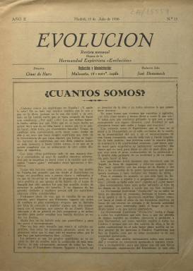 La colección de este título en la Biblioteca Nacional de Española sólo la forma su número 15, del 15 de julio de 1936. Indica su segundo año de edición, por lo que, siendo una “revista mensual”, pudo comenzar a publicarse en 1935. Su director, César de Haro, y su redactor-jefe, José Domenech Vidal (Elías), eran el presidente y vicepresidente de la Hermandad Espiritista Evolución, respectivamente, de la que era órgano de esta sociedad que tenía su “taller” en la calle Malasaña, de Madrid, y había sido fundada en 1934. Es una entrega de una docena de páginas, compuestas a dos columnas, con textos relativos al espiritismo, cuyo máximo exponente había sido Allan Kardec (1804-1869). Los principales autores de sus textos son los “hermanos” ya citados, tal como se reconocen los seguidores de este movimiento. Entre estos aparecen los titulados Ecos del más allá, y el poema El enojo, firmado por César de Haro; y Panoramas de la creación infinita: reencarnación, firmado por José Domenech; así como el escrito por el médium Ernesto Pérez Méndez, bajo el epígrafe Desde el más allá. También publica un folletín con el título Impresiones del verdadero vivir; y se anuncia la colaboración de José María Seseras y de Batlle, que había presidido la organización del V Congreso Internacional Espiritista, celebrado en Barcelona en 1934, quien publica un texto bajo el epígrafe El espiritismo y la sociología.