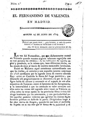 El redactor de El fernandino se trasladará con Fernando VII de Valencia a la corte, en donde publicará este periódico, que pretende salir ahora los martes y viernes (bisemanal). La colección de la Biblioteca Nacional de España está formada por su primer número, de 14 de junio de 1814, de ocho páginas, señalando Gómez Imaz que en su prospecto se expresaba que su misión era “ilustrar a la opinión pública sobre los derechos sagrados del Rey y del Altar, sobre los que corresponden a las demás clases del Estado, y sobre el encarnizamiento criminal de los facciosos de estos últimos tiempos en su empeño de destruirlos”. Periódico reaccionario, que incluye artículos de opinión y de oficio, así como extractos de otros periódicos, con noticias sobre la restauración del absolutismo en España.
