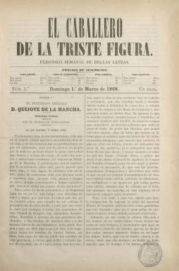 Efectivamente, el propio Martínez Rives dividirá El Caballero de la triste figura, al que subtitula “periódico semanal de bellas artes” –aunque esté casi completamente dedicado a la literatura–, en cuatro secciones. En la primera incluirá su recreación quijotesca, que ocupará prácticamente la mitad de cada entrega; y en las restantes cuatro páginas, la sección segunda, bajo el epígrafe Romances españoles; la tercera, con textos de costumbres, filosofía y crítica, y la cuarta, de variedades, con composiciones en verso y charadas, principalmente. Martínez Rives contará para este periódico con Jacinto Ontañón y Arias y Manuel Martínez Añibarro como colaboradores.