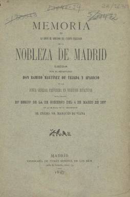 Memoria de la Junta de Gobierno del Cuerpo Colegiado de Caballeros Hijos-dalgo de esta M. H. Villa de Madrid || Memoria de la Junta de Gobierno del Cuerpo Colegiado de Caballeros Hijosdalgo de esta M. H. Villa de Madrid || Memoria de la Junta de Gobierno del Cuerpo Colegiado de la Nobleza de Madrid || Título de la anteportada: Memoria para la Junta General de ...