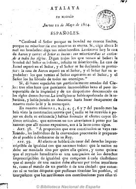 Reimpresión en Sevilla de algunos números del periódico antirreformista y defensor de Fernando VII que se editaba en Madrid con el mismo título. De periodicidad semanal, comenzó el 12 de mayo de 1814 y cesó en julio del mismo año. En los números de la Atalaya se encuentran multitud de ataques a los liberales, escritos con la vehemencia característica de los partidos políticos de esa época.