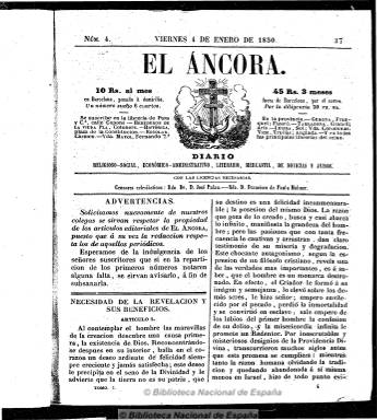 Su largo subtítulo –diario religioso-social, económico-administrativo, literario, mercantil, de noticias y avisos- ya puede dar idea de lo que va a ser un periódico que aparece el uno de enero de 1850 fomentado desde el catolicismo tradicional para combatir la difusión de las nuevas ideas políticas y sociales, que denuncian no sólo las prerrogativas que mantiene la iglesia durante la construcción del Estado liberal. En Barcelona, a la cabeza de este periodismo militante católico y conservador, que tacha las ideas innovadoras de “disolventes”, se pone el canónigo y catedrático Antoni Palau i Termens (1806-1862), que ya venía publicando Revista católica (1842-1868), de mayor calado apologético y doctrinal, y que también forma parte de la colección de la Biblioteca Nacional de España.