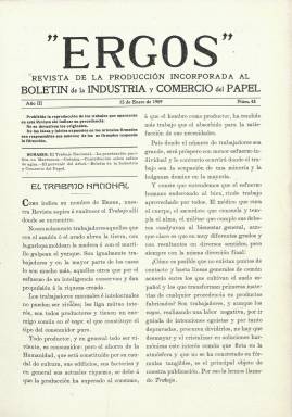 Publicación quincenal que aparece el 15 de enero de 1909, pero siguiendo la secuencia (año III, número 48) del Boletín de la industria y comercio del papel, que se había publicado previamente en 1907 y 1908, e incluyendo a éste en la misma entrega y con su propia cabecera. Reinicia la numeración de las páginas, pero ambos títulos comparten la misma foliación. Bajo la cabecera Ergos se indica el subtítulo “revista de la producción incorporada al Boletín de la industria y comercio del papel”, continuando también éste la secuencia de la serie. El artículo de presentación del nuevo título, bajo el epígrafe El trabajo nacional, hace referencia a su significado en griego: Trabajo, aludiendo a la alianza entre los productores manuales e intelectuales, entre los productores y los consumidores, y al hecho de que la producción industrial hubiera superado al consumo, ofreciendo asimismo un canto elogioso a la laboriosidad de la sociedad.