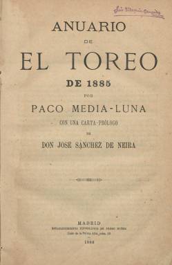 Impreso en el madrileño Establecimiento Tipográfico de Pedro Núñez en 1886, en formato 4º mayor, y de 156 páginas, corresponde al año 1885, compilado por Paco Media-Luna, seudónimo del periodista, dramaturgo y por último político Emilio Sánchez Pastor (1853-1953), director y editor de la revista El Toreo (1874-1928), una de las más longevas y populares del periodismo taurino español. Comienza con una carta-prólogo firmada por el también escritor y crítico taurino José Sánchez de Neira (1823-1898), y contiene las reseñas de las corridas de toros celebradas en Madrid, acompañadas de cuadros estadísticos, con los nombres de los toros, ganaderías, banderilleros y pases; así como extractos de reseñas de las verificadas en el resto de las provincias españolas. Al final, contiene una relación de sucesos notables referidos a la tauromaquia, reseñados mensualmente. Se desconoce la existencia de otros anuarios publicados por esta revista, cuyo título también forma parte de la colección de la Biblioteca Nacional de España.