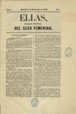 A los pocos meses de que en la Asamblea Nacional francesa –durante el período de su segunda república (1848-1851)- fuesen reivindicados nuevos derechos para la emancipación de la mujer y en pleno gabinete isabelino ultramoderado presidido por Juan Bravo Murillo, aparece Ellas, que, subtitulada “órgano oficial del sexo femenino”, va a iniciar una visión del periodismo femenino desconocido hasta entonces en España, por su tono avanzado, reivindicativo y liberal radical, que lamentará el yugo en el que el hombre tiene sometida a la mujer.