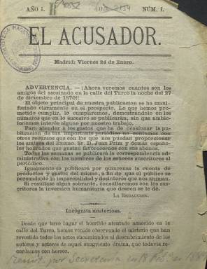 En la “Advertencia” con la que empiezan las tres primeras entregas se dirá: “Ahora veremos cuántos son los amigos del asesinado”, a los que –junto a los “demás españoles honrados”, añade- pide que favorezcan al periódico a través del correspondiente abono de suscripción. Las iniciales y poblaciones (y a veces los cargos públicos que ostentan) de sus suscriptores los incluirá en una sección fija denominada Correspondencia administrativa. Al final, pagados los gastos de impresión, señalará que el dinero sobrante irá destinado “a la redención de esclavos en las Antillas”.