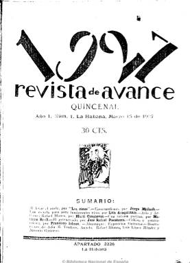 Es considerada como la publicación más importante y singular del movimiento de renovación integral de la vida artística, literaria, intelectual y política cubana. Fue difusora de las vanguardias europeas, principalmente la española, así como de otras literaturas y artes del continente americano, y órgano de sus entonces jóvenes intelectuales o lugar de exhibición del vanguardismo plástico, estético y literario cubano, que la propia revista inauguró. Se publica entre los años 1927 y 1930, centro cronológico del grupo generacional artístico y político (1923-1933) que fue pórtico de la posterior revolución cubana, tal como lo expresa Carlos Ripoll en su ensayo de 1964 sobre la revista. Comienza a publicarse, en entregas quincenales, el 15 de marzo de 1927, siendo sus editores los fundadores del Grupo Minorista, Alejo Carpentier (1904-1980), Francisco Ichaso (1901-1962), Jorge Mañach (1898-1961), Juan Marinello (1898-1977) y Martí Casanovas (1894-1966), siendo este el único español, pero radicado en Cuba. Se la conoce para identificarla por el subtítulo “revista de avance” que adoptó y prevaleció en su portada (estampada a color con plástica vanguardista), aunque su verdadera cabecera fue cambiante y correspondió a cada año de edición: 1927, 1928, 1929 y 1930. Ello fue un signo más de la actitud transgresora de las vanguardias y sobre el particular los propios editores escribieron en su artículo de presentación, bajo el epígrafe Al levar el ancla: “No que creamos que 1927 signifique nada, sin embargo. El año que viene, si aún seguimos navegando, pondremos en la proa ’1928’; y al otro, ‘1929’; y así… ¡Queremos movimiento, cambio, avance, hasta en el nombre!”. En el segundo número, Carpentier será sustituido en el consejo editorial por José Zacarías Tallet (1893-1998), que permaneció en el hasta el número 26; y cuando Casanovas es acusado de comunista, encarcelado y expulsado del país, su puesto será ocupado, desde el número once, por Félix Lizaso (1891-1967), por lo que continuaron siendo “Los Cinco” o “Los 5” (a partir del número 27, serán cuatro) los firmantes del primer artículo de cada entrega, que, bajo el epígrafe Directrices, es considerada la sección más importante de la revista, en la que se comentarán temas y acontecimientos culturales y artísticos o los conflictos políticos de Cuba y otros de carácter internacional. En esta especie de sección editorial se escribirá sobre los centenarios de Góngora o Goya, se defenderá la reforma universitaria cubana, se censurará el imperialismo, se auspiciarán exposiciones o se dará respaldo a las vanguardistas. Otras secciones de la revista son Letras hispánicas y Letras extranjeras, en las que se ofrecen las novedades estéticas y literarias. En la primera sus editores y colaboradores escriben comentarios sobre obras y trabajos que vienen de fuera de la isla, de españoles como Dámaso Alonso, Luis Araquistain, Ramón Gómez de la Serna, Federico García Lorca, Guillermo de Torre, Ramón María del Valle Inclán o de Azorín, o del argentino Jorge Luis Borges; pero también de los autores cubanos, como el propio Lizaso, Eugenio Florit, Mariano Brull o Regino Boti. En la segunda son comentadas, entre otras, obras de Waldo Frank, Curzio Malaparte o Henri Babusse. En la sección Almanaque se publicarán reseñas o notas sobre la otra cultura europea y americana, de sus libros, obras teatrales y cinematográficas o de síntesis de revistas, y en la misma aparecen comentadas conferencias de Ramiro de Maeztu, Américo Castro, Gregorio Marañón, Max Enríquez Ureña o José Vasconcelos, así como acontecimientos nacionales y culturales cubanos: exposiciones, conciertos, homenajes e inauguraciones. Y en la titulada Index Barbarorum serán enjuiciados errores o abusos del lenguaje. A ello, la revista suma artículos, ensayos, textos en verso, fragmentos de novelas, narraciones, semblanzas y críticas literarias, pictóricas, musicales o teatrales. Así, aparecen por vez primera traducidos en la isla textos de Jorge Santayana, André Gide o Máximo Gorki, ensayos de Bertrand Russell o críticas de John Dos Passos, Ezra Pound o Paul Valéry, o un drama de Eugene O’Oneill. La base ideológica de la revista se enmarcará en un verdadero descubrimiento y revalorización del pensamiento del “héroe nacional” José Martí (1853-1895), en la búsqueda de las raíces de la nacionalidad y la identidad cubanas y en el combate contra el imperialismo y el caudillismo, pero sin corsé partidista. Ripoll señala que muchas de las mejores páginas de Mañach, Marinello, Ichaso y Lizaso se escribieron en esta revista, pero la nómina de escritores cubanos que la enriquecieron es larguísima, comenzando muchos de ellos aquí sus carreras literarias, y entre estos aparecen Agustín Acosta, Regino E. Boti, Mariano Brull, Alfonso Hernández Catá (de origen español), Enrique José Varona, Medardo Vitier o José María Chacón y Calvo. Además de escribir sobre el vanguardismo o sobre Martí, lo harán sobre el criollismo, la intelectualidad y las inquietudes cubanas, sobre arte y política, pero también sobre Henrik Ibsen, Luis de Góngora o Fernando de los Ríos. Entre los colaboradores españoles estuvieron José Ortega y Gasset, Miguel de Unamuno (que ofrece una curiosa interpretación del vanguardismo cubano), Américo Castro, Francisco Ayala, Guillermo Díaz Plaja, Benjamín Jarnés, Eugenio D’Ors, Fernando de los Ríos o Araquistain, así como el poeta Federico García Lorca, y los hispanoamericanos Alfonso Reyes o César Vallejo, entre otros muchos. Manuel Aznar, Ramiro de Maeztu o Mañach escribieron sobre la “esencial incomprensión entre España y América”; Leopoldo Lugones y Araquistain polemizan sobre cuestiones internacionales; se respalda al Grupo Minorista y la independencia cubana, su arte vernáculo y el nuevo; se protesta por el encarcelamiento de sus