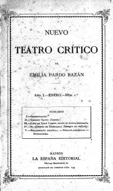 Se trata de una revista cultural mensual editada y redactada enteramente por la escritora Emilia Pardo Bazán, quien empleó la herencia dejada por su padre para poner en marcha este proyecto. Tituló así la publicación en honor del padre Benito Jerónimo Feijoo, a quien admiraba y cuya obra Teatro Crítico Universal quería imitar en cuanto a la amplitud de criterio para acoger lo nuevo y desechar los prejuicios. Pese al trabajo que le suponía, dado que no dejó otras ocupaciones intelectuales mientras editaba la revista, Pardo Bazán estuvo publicándola durante tres años y con unas cien páginas por número hasta un total de 30 entregas, puesto que en el último año, 1893, se publicó cada dos meses. En la presentación que hizo en el primer número declara lo que le gustaba de Feijoo: ‘Apetezco su energía para afirmar la verdad, su claridad nítida, su graciosa variedad, su amenidad encantadora, que aun trasciende hoy, como el generoso vino de la solera vieja’. Y hace un elogio del periodismo del siglo XVIII y de algunos periodistas ilustrados a los que pretende imitar por su facilidad para abordar todas las facetas de la vida y de la cultura. También se propone hacer crítica literaria ponderada, algo que echaba en falta en España, y estudios de escritores. El de Pedro Antonio de Alarcón ocupará tres números de la revista. Pardo Bazán deja claro desde el primer momento que pretende luchar por la educación de la mujer y por su derecho a ser equiparada al hombre. Se llama a sí misma ‘individuo de la casta de los parias’ por no tener derecho al voto. Hay que poner en su contexto estas palabras, dado que sólo un año antes de salir la revista se había aprobado la ley del sufragio universal masculino. Serán numerosos los artículos de índole feminista que escribirá durante la corta vida de la publicación. Y tendrá que enfrentarse en este aspecto incluso a escritores de la talla de Leopoldo Alas, Clarín. El Centro de Estudios de la Mujer de la Universidad de Alicante publicó en 2003 un trabajo de Rocío Charques Gámez, titulado ‘Los artículos feministas en el Nuevo teatro crítico de Emilia Pardo Bazán’, obra que puede consultarse en línea. Con ocasión de la muerte de Concepción Arenal, otra pionera del feminismo español, Pardo Bazán le dedicará el artículo elogioso ‘Concepción Arenal y sus ideas acerca de la mujer’, en el número 26 de febrero de 1893. La escritora también abordará la política, pero de una manera que ella llama ingenua dada su falta de ataduras con ningún partido. Y afirma: ‘Para mí, la óptica del problema político es radicalmente distinta que para los políticos militantes: ellos ven el advenimiento o la caída de los suyos; yo veo España... que patria, dígase la verdad, aún no nos han prohibido tenerla a las mujeres’. La revista estaba estructurada en secciones fijas y secciones variables. Estas últimas incluían artículos sobre viajes, historia, cuestiones religiosas y crónicas diversas. Las secciones fijas la componían un cuento o novela corta; un estudio crítico-literario sobre libros, o dramas o comedias recientes, biografías, semblanzas o necrológicas de autores ilustres, nacionales y extranjeros; así como artículos sobre una cuestión social o política de actualidad o sobre personalidades políticas. En Nuevo Teatro Crítico uno de los temas polémicos que trató la escritora es el referente a su solicitud para ocupar un sillón de la Real Academia. Fue rechazada hasta tres veces y con el voto en contra de destacados escritores. En el número 3 de marzo de 1891 aborda por primera vez la cuestión y afirma que no pedía entrar en la Academia por satisfacer una ambición personal sino por reivindicar el derecho de las mujeres a entrar en toda clase de academias. En el último número de la revista, de diciembre de 1893, Pardo Bazán anuncia el cese de la publicación. Alega cansancio, razones de índole personal, pero también deja entrever que había desinterés por la cultura en España y que su revista apenas había llegado a tener difusión. Y acaba con estas palabras: ‘La única redactora del Teatro conservará siempre el recuerdo de las pruebas de cariño, respeto y simpatía que ha debido a sus constantes lectores; pruebas tan halagüeñas a veces que, a pesar de lo mucho que necesito el descanso, siento pena al cortar esta comunicación asidua con una escogidísima parte del público español’. [Descripción publicada el 7/5/2020]