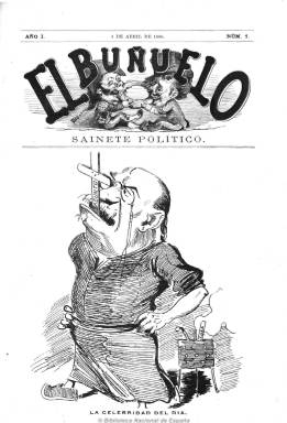 Se le atribuye su fundación al escritor festivo y satírico madrileño Salvador María Granés (1840-1911), que usó el seudónimo Moscatel, apareciendo su primer número el cuatro de abril de 1880, en pleno gobierno del conservador Antonio Cánovas del Castillo y cuando Práxedes Mateo Sagasta acaba de fundar el Partido Liberal Fusionista, que un año después alcanzará el poder, en el primer ensayo de alternancia o turno de partidos de la Restauración. Es un periódico satírico y burlesco de marcado carácter político y antimonárquico, en el que destacarán las caricaturas de personajes del régimen, especialmente las trazadas por el dibujante republicano Eduardo Sojo (1849-1908), conocido por su seudónimo Demócrito, algunas de las cuales son litografiadas a doble página y a color, con la denominación de “cromos”. Apareció dos días a la semana (jueves y domingo), y en otras ocasiones fue semanal (jueves), en entregas, generalmente, de ocho páginas, compuestas a dos columnas, saliendo de diversas imprentas, entre ellas la de Fortanet, pero siendo estampadas sus litografías en las de A. Forny o M. González, entre otras causas, quizá debido a los problemas que tuvo con la censura. Así, en su entrega número 10, de tres de junio, hace una advertencia sobre su elaboración tras la censura previa que había padecido por parte del gobernador civil, el conde de Heredia-Spínola. Sus textos son de naturaleza variada, escritos tanto en prosa como en verso, y para los primeros se utilizan diversos géneros (artículo, narración, comedia, etc.), así como breves comentarios, algunos de ellos sobre los periódicos de la época, y todos en un radical estilo burlesco y satírico, referidos casi siempre a la situación política y gubernamental, aunque también a la actualidad literaria y teatral madrileña. Se dice en la información administrativa de esta publicación -subtitulada “sainete político”-, que será “la más política, la más ilustrada, la más barata y la más conservadora de cuantas de este género han visto y ven la luz en nuestra patria y en las posesiones más o menos interinas”, añadiendo que “será de oposición permanente, mande quien mande (por abrigar el presentimiento de que han de tardar en subir los suyos)”. También señala que es “redactado por varios jóvenes muy apreciados en sus respectivas casas”. Aunque sus textos carecen, generalmente, de firmas, entre sus redactores estuvieron el escritor y periodista anticlerical y antimonárquico José Nakens Pérez (1841-1926) y Juan Vallejo Larriaga. En su primer número, el escueto programa de la publicación aparece bajo la firma de Ramón de la Cruz Cano. La dirección de la revista es atribuida al escritor y periodista madrileño Eduardo de Lustonó (1849-1905), que usó el seudónimo Albillo. Éste, junto a Nakens y Vallejo dejan la redacción, haciéndose cargo de la dirección Francisco Bueno, a partir del número 48, de 27 de febrero de 1881, reduciendo sus páginas a la mitad y apareciendo jueves y domingos. Además de caricaturas de políticos (en su primer número publica en la portada la de Cánovas, de una serie que titula Las celebridades del día), inserta otros dibujos humorísticos, especie de parodias, y entre sus ilustradores cuenta también con Alfredo Perea Rojas (1839.1895) o Manuel Luque de Soria (1854-1924). Siendo El Buñuelo una publicación en la que se advierte ya la modernidad que alcanzó en España este tipo de periodismo, la mayor parte de sus artífices literarios y artísticos participaron en las principales revistas satíricas y festivas de la Restauración. El último número de la colección de este título en la Biblioteca Nacional de España es el 51, correspondiente al 10 de marzo de 1881, pero Cazotes (1982) da cuenta también del número 52, del 17 de marzo, por lo que su publicación se extendió apenas un año. Editó un Almanaque del Buñuelo para 1881, que también puede consultarse en esta Hemeroteca Digital de la BNE. Nakens y Vallejo, con la destacada participación de Demócrito, fundarán a continuación el famoso republicano y anticlerical El Motín (1881-1926). Algunas imágenes cedidas por TECNODOC.