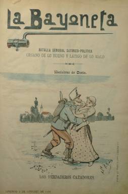 Con el subtítulo” “batalla semanal satírico-política: órgano de los bueno y látigo de lo malo”, forma parte del grupo de decenas de periódicos de carácter humorístico e ilustrado de corta vida, que, con chistes gráficos y “monos”, fueron publicados durante las últimas décadas del siglo diecinueve. En este caso, La Bayoneta publicó, desde el 25 de septiembre al 18 de diciembre de 1892, sólo trece entregas, de ocho páginas cada una, con la primera y las centrales estampadas a varias tintas. Salía de la Litografía de Méndez. Se dedicó preferentemente a prestarle atención con sus chistes y caricaturas al estamento militar, y adopta diferentes precios para sus suscriptores, según fueran jefes u oficiales militares, individuos de tropa o civiles. Compuestas sus páginas a tres columnas, inserta también textos humorísticos, que en su sección La semana en campaña son sueltos breves. También tiene una sección de crónicas de Teatros y, además de a asuntos sociales y de costumbres, dedica asimismo atención a los políticos. Se congratuló (número 12) por el ascenso del general Francisco Borrero y Limón (1840-1908), al que le pidió que actuara políticamente, en un año en el que , junto a Cánovas del Castillo, este militar fraguó una conspiración contra la regente María Cristina. Se desconoce a los artífices de este semanario, en el que aparecen como firmas los seudónimos Porras, Palha, Bomba, Pito o El Cadete.