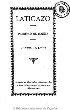 Reimpresión del año 1905 de los números 1, 2, 4 y 6 del periódico titulado Latigazo, según los ejemplares existentes en el Archivo de Indias. Apareció en mayo de 1821 y, sin periodicidad fija, aunque probablemente mensual, es uno de los periódicos que se publican en Filipinas al calor de la restauración de la libertad de imprenta durante el Trienio Liberal. Su primer número es impreso en Sampáloc, y los demás salen de la Imprenta de Santo Tomás, de Manila. Su autor, un hispano-filipino que firma bajo las iniciales F.V., inserta en cada número un extenso artículo dialogado, en prosa y en verso y con algún acento sarcástico, con el que polemiza sobre los principios constitucionales doceañistas, el espíritu ilustrado, el liberalismo y el clericalismo, y también sobre los acontecimientos políticos que se suceden en la colonia española, polemizando también con El ramillete patriótico, otro de los periódicos que se publican durante este periodo en Filipinas.
