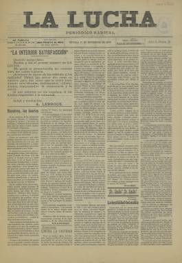 Periódico Radical en Sevilla que comenzó a editarse en 1906 y salía según anunciaba en su cabecera ocho veces al mes. Se trata de una publicación de contenido marcadamente político con ideario republicano que ha dejado poco rastro y de la que la Biblioteca Nacional de España posee solo el número 3 de 11 de noviembre de ese año. Probablemente fue de vida breve. Este número se abre precisamente con un saluda del líder nacional Alejandro Lerroux, quien aún no había fundado el Partido Radical pero que ya había agrupado en torno a su persona en Barcelona y otras provincias a republicanos anticlericales, obreristas y anticatalanistas. El partido se creó en 1908 de una escisión de la Unión Republicana. Años después Lerroux centró su discurso y se acercó a las clases medias, lo que le llevó a presidir el Gobierno de España junto con la derecha durante la II República. No era este el caso en sus inicios, como se puede ver en el saluda de tono revolucionario que dirigió a este periódico sevillano de sus partidarios: ‘¡Adelante la legión de los rebeldes y los radicales! Habrá que salvar dos cosas en nuestro país, dos cosas que se están hundiendo mixtificadas, deshonradas, vilipendiadas, traicionadas: la democracia y la patria’. La Lucha constaba de cuatro páginas en las que primaban los artículos de fondo con el ideario del periódico, aunque también se dedicaba espacio a la información internacional, nacional y, por supuesto, local. Se trata de diversas secciones que llevan el nombre de revista. Así, había la sección revista internacional, la de política, la revista obrera, con información sobre los trabajadores, huelgas y la Casa del Pueblo de Sevilla, y la revista teatral con información sobre la cartelera sevillana. La información local era la más destacada. Es curioso como en las páginas del periódico hay apelaciones al ¡Sr Alcalde! en letras mayúsculas y en negrita para así mejor llamar la atención de la primera autoridad municipal, a quien se hace responsable de los problemas que sufre la ciudad. En el Ayuntamiento de Sevilla había ya concejales republicanos. El periódico estaba dirigido por Manuel Díaz Rosales y tenía como redactores a Félix Silva y Lucas Froment. Entre los colaboradores figuraba el escritor Manuel María de Soto y Vázquez, cuyo seudónimo era ‘Un soldado viejo’ y a quien iba dirigido el saluda de Lerroux. Unos veinte años antes, durante 1883 y 1884, se publicó en Sevilla un periódico con el mismo título de La Lucha y que era órgano del partido republicano progresista, por lo que es previsible que la publicación nacida en 1906, con el republicanismo ya bien asentado en España, se sintiera heredera de aquella. [Descripción publicada el 1/12/2022]