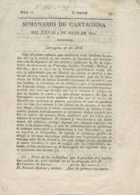 Uno de los periódicos de corta existencia que eclosionan en esta ciudad durante el Trienio Liberal, editado, probablemente, según los datos recabados por Gil Novales (1975) por el cirujano de la Armada y miembro de la Sociedad de los Virtuosos Descamisados Manuel de Navas, que usó en la prensa del periodo el anagrama Vasan para firmar sus artículos, y que sería desterrado a Cádiz en julio de 1822. Su impresor es el también liberal y constitucionalista Ramón Puchol. De periodicidad semanal, de cuatro páginas y compuesto a una columna, el único ejemplar que se conoce es el número 15, correspondiente al jueves, tres de mayo de 1821, procedente de la absorbida Hemeroteca Nacional. Comienza con una noticia, fechada en Cartagena el 27 de abril, sobre las noticias leídas en la Tertulia Política de esta ciudad sobre la expulsión de serviles en Barcelona, Valencia, Sevilla, Granada, Málaga y Oviedo, y continúa con la lista de los serviles que son obligados a salir de Cartagena. También incluye un artículo comunicado del corresponsal D.A.J. desde Mazarrón dando la noticia de la creación de la Milicia Nacional en esta población. En relación con esta publicación, la BNE dispone de una hoja suelta impresa también por Puchol titulada Contestación al Suplemento segundo al Semanario de Cartagena del jueves 5 de julio, de la que Gil Novales recaba el seudónimo El Consabido.