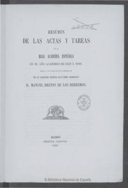 Con este título, en la colección de la Biblioteca Nacional de España se encuentran los correspondientes a los años académicos de 1859 a 1860, 1860 a 1861 y 1861 a 1862, que previamente habían sido leídos por el secretario perpetuo de esta corporación, el dramaturgo, poeta y periodista Manuel Bretón de los Herreros (1796-1873), en las correspondientes juntas públicas que se celebran durante el mes de septiembre de cada año para solemnizar el aniversario de la fundación de la Real Academia Española, que data de 1713. En los correspondientes impresos, de unas dos docenas de páginas cada uno, compuestas a una columna, se da cuenta de los trabajos que se llevan cabo en la institución en cada curso académico, como son la elaboración de la Gramática, Ortografía y Prosodia, o la de seis diccionarios: de Provincialismos, Sinónimos, Neologismos, Etimológico, de Voces y de Rimas. También da cuenta de la reforma del reglamento, fallecimiento de académicos o elección de los correspondientes, o de las obras literarias que la Academia manda imprimir, entre otros muchos asuntos. El impreso en 1860 contiene también el Acta de la sesión pública celebrada sobre el certamen extraordinario para conmemorar las glorias de la Guerra de África. En el de 1861, se da cuenta de los trabajos para los actos conmemorativos de Cervantes y Lope de Vega y de las convocatorias para el concurso de premios de 1863 y 1865, y tanto este como el siguiente incluyen un Apéndice, con una relación de libros adquiridos por compra o donativo, que firma su bibliotecario perpetuo, Eusebio María del Valle. A partir del curso 1862-1863, modifica su título: Resumen de las tareas y actos de la Real Academia Española en el año académico de…, que también forma parte de esta Hemeroteca Digital.