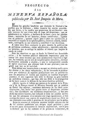 Se trata del prospecto, sin fecha ni pie de imprenta, que anuncia la aparición de un periódico con esta cabecera, a partir de primeros de mayo de 1820, publicado por el ilustrado José Joaquín Mora, con artículos doctrinales y de fondo, noticias nacionales y extranjeras y extractos de otros periódicos, entre otros contenidos. En este mismo prospecto se señala que se trata de una “empresa diferente” a cualquier Minerva que se haya publicado (en referencia a la publicada por Pedro María de Olive entre 1805 y1818), pero también a cualquier otra que se publique ahora. Aún así, este título ha dado lugar a confusión, ya que a partir del dos de mayo del mismo año empieza a publicarse también Minerva española, como periódico “político y militar” y frecuencia decenal, redactado y dirigido a militares por el liberal Agustín de Letamendía, en el que colaboran Miguel Tenorio y el conde de Moreti, con una primera época hasta el 31 de octubre de ese año, y otra segunda, desde el uno de enero de 1821 hasta septiembre de este . Por ello el periódico anunciado por Mora en este prospecto adoptará, sin embargo, el título de Minerva nacional, editando hasta cuatro cuadernos, que forman un primer tomo de mayo a julio de 1820 de 484 páginas, estampados en la Imprenta de Repullés, y en octubre del mismo año se anuncia la continuación de un segundo tomo de un periódico en cuyo prospecto ya se expresaba un carácter constitucionalista y liberal y contrario al despotismo y al fanatismo absolutista. Mora, que interviene en otros proyectos periodísticos del Trienio Liberal, se radicalizará al final de periodo y se exiliará a Inglaterra en 1823, mientras que en la lista de libros prohibidos por la Inquisición durante la década ominosa aparecen dos tomos de su Minerva nacional, en concreto por el obispo de Cuenca el 22 de noviembre de 1825.